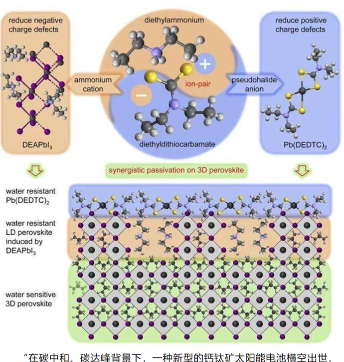 目前市場上的研究工作主要集中于解決單方面的問題來提升太陽能電池的效率和穩(wěn)定性,通常只針對鈣鈦礦材料的其中某個成分進(jìn)行優(yōu)化,或者單個化學(xué)環(huán)境的優(yōu)化來實現(xiàn)效率和穩(wěn)定性的同步提升。論文共同第一作者、副研究員王艾菲表示:“我們團隊的這項研究成果,利用加入陰陽離子對的協(xié)同作用,從多方面、全方位對鈣鈦礦材料進(jìn)行缺陷鈍化,改變化學(xué)性質(zhì)從而實現(xiàn)效率和穩(wěn)定性的二者兼得。”