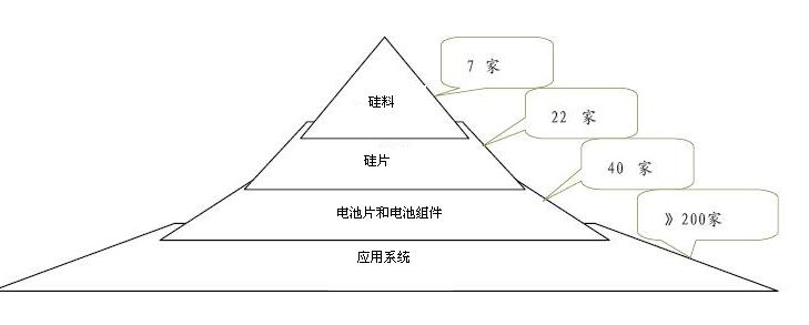 光伏產(chǎn)業(yè)鏈的結(jié)構(gòu)光伏產(chǎn)業(yè)鏈包括硅料、硅片、電池片、電池組件、應(yīng)用系統(tǒng)5個環(huán)節(jié)。上游為硅料、硅片環(huán)節(jié);中游為電池片、電池組件環(huán)節(jié);下游為應(yīng)用系統(tǒng)環(huán)節(jié)。從全球范圍來看,產(chǎn)業(yè)鏈5個環(huán)節(jié)所涉及企業(yè)數(shù)量依次大幅增加,光伏市場產(chǎn)業(yè)鏈呈金字塔形結(jié)構(gòu)(圖1)。