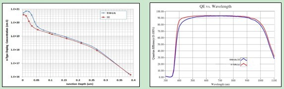 圖1:SE電池表面摻雜濃度明顯低于傳統(tǒng)電池 圖2:SE電池的短波響應(yīng)明顯優(yōu)于傳統(tǒng)電池