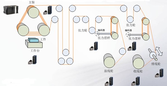 對于線切割機來說,主軸伺服和收、放卷軸間同步控制以及金屬絲線間的張力控制總是此類機械的控制關鍵點。歐姆龍NJ501型控制器,通過EtherCAT總線連接多套伺服,正是解決同步控制的最佳組合。