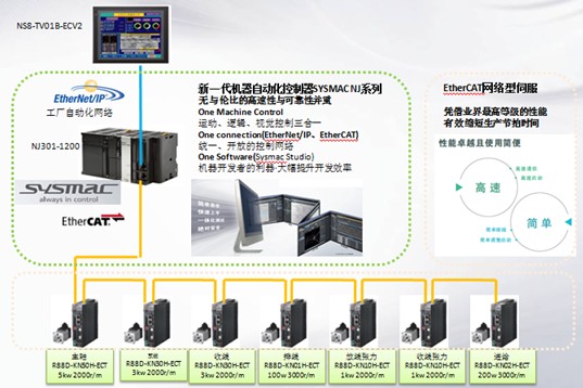 SYSMAC NJ系列機器控制器是歐姆龍最新推出的新一代機器自動化控制器,它無與倫比的高速性與可靠性并重,集運動、邏輯、視覺控制于一體,擁有直線、圓弧等的插補動作功能和電子齒輪、電子齒輪的同步動作功能,通過電子齒輪FB實現(xiàn)同步以及張力調(diào)整 ,可執(zhí)行最小500μs的高速運算,實現(xiàn)4至64軸的運動控制。尤其是內(nèi)置EtherNet/IP與EtherCAT主站,可實現(xiàn)網(wǎng)絡的高速控制,SYSMAC STUDIO還有MC功能軸設定功能,使伺服軸設定非常簡單。而系統(tǒng)中采用的EtherCAT網(wǎng)絡型伺服,其憑借業(yè)界最高等級的性能,可幫助用戶有效縮短生產(chǎn)節(jié)拍時間。