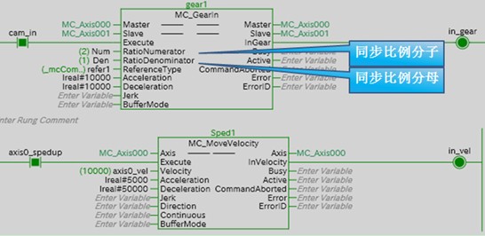 主旋轉(zhuǎn)軸設定為主軸,收、放線軸做從軸。首先建立從軸與主軸的基本電子齒輪比,使用MC_GearIN指令建立連接,再使用MC_MoveVelocity啟動主軸,以后PID微調(diào)的MV輸出可通過改變基本電子齒輪比實現(xiàn)對主,從軸之間的同步,張力控制,程序如圖3所示。