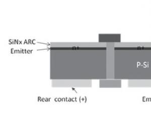 圖一給出常規(guī)MWT太陽(yáng)能電池的截面圖。MWT太陽(yáng)能電池與傳統(tǒng)太陽(yáng)能電池結(jié)構(gòu)相比,主要不同點(diǎn)是前者表面的發(fā)射極所收集的電流由穿過(guò)硅基體的金屬導(dǎo)線引導(dǎo)到電池的背面,使得其正負(fù)電極都位于電池的背面。因此在制作MWT電池光伏組件時(shí),電池片之間的連接均由背面接觸電極提供。這樣既不需要為了方便焊接而在電池正表面制作導(dǎo)電主柵線,又可降低由連接焊帶引起的電阻損耗,從而提高了電池轉(zhuǎn)化效率和組件輸出功率,將電池到組件(CTM)損耗降低到最小。