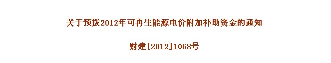 根據《財政部 國家發(fā)展改革委國家能源局關于印發(fā)<可再生能源電價附加補助資金管理暫行辦法>的通知》(財建〔2012〕102號,以下簡稱《管理辦法》),現(xiàn)預撥你。▍^(qū)、市)2012年可再生能源電價附加補助資金,具體金額見附件2(政府收支分類科目:2116001 風力發(fā)電補助,2116002 太陽能發(fā)電補助,2116003 生物質能發(fā)電補助)。