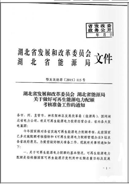 近日湖北省發(fā)改委和能源局聯(lián)合發(fā)文,鄂發(fā)改能源【2015】115號(hào)文件,湖北省發(fā)改和改革委員會(huì) 湖北省能源局 關(guān)于做好可再生能源電力配額考核準(zhǔn)備工作的通知