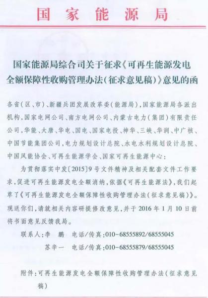 近日,為進(jìn)一步落實(shí)《中共中央國務(wù)院關(guān)于進(jìn)一步深化電力體制改革的若干意見》(中發(fā)[2015]9號文)及相關(guān)配套文件的有關(guān)要求,國家能源局起草了《可再生能源發(fā)電全額保障性收購管理辦法(征求意見稿)》(下稱《辦法》),并向全社會廣泛征求意見。