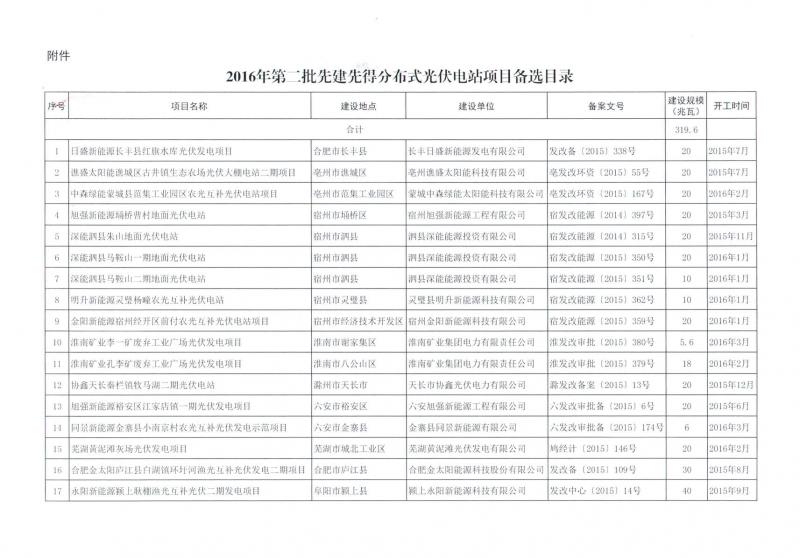 安徽省能源局關(guān)于2016年第二批先建先得分布式光伏電站項目備選目錄的通告