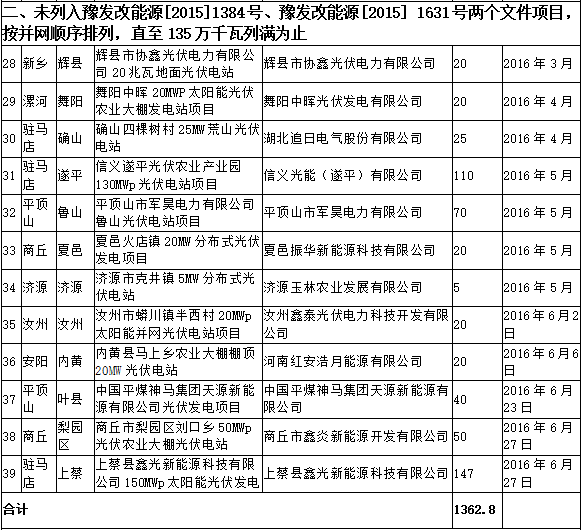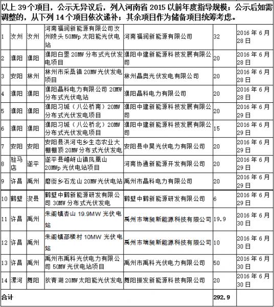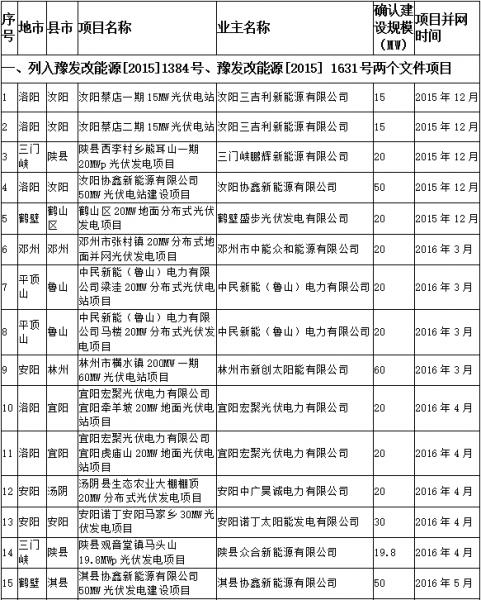 根 據(jù)《國家發(fā)展改革委關(guān)于完善陸上風(fēng)電光伏發(fā)電上網(wǎng)標(biāo)桿電價(jià)政策的通知》(發(fā)改價(jià)格[2015]3044號(hào))、《河南省發(fā)展改革委關(guān)于有序推進(jìn)光伏發(fā)電項(xiàng)目 建設(shè)和調(diào)整列入2015年以前年度指導(dǎo)規(guī)模項(xiàng)目的通知》(豫發(fā)改能源[2016]720號(hào))和《河南省發(fā)展和改革委員會(huì)辦公室關(guān)于確認(rèn)光伏電站并網(wǎng)容量的 通知》(豫發(fā)改辦能源[2016]39號(hào))文件規(guī)定,現(xiàn)對(duì)6月30日前已并網(wǎng)的光伏電站予以公示,按照國家批復(fù)河南省2015年以前年度指導(dǎo)規(guī)模(共 135萬千瓦),擬將前39個(gè)項(xiàng)目列入河南省2015年以前年度光伏電站指導(dǎo)規(guī)模,請(qǐng)予監(jiān)督。如發(fā)現(xiàn)情況有誤或不實(shí),需據(jù)實(shí)提供相關(guān)依據(jù),以書面形式正式 反饋我委。