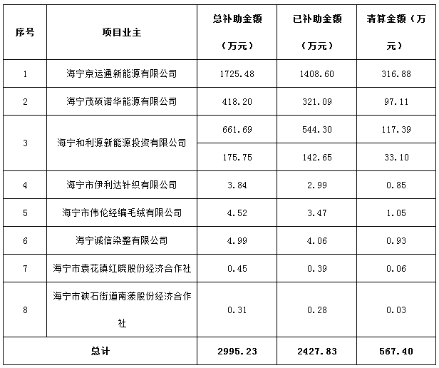根據(jù)海寧市人民政府辦公室《關(guān)于促進(jìn)我市光伏產(chǎn)業(yè)健康發(fā)展的若干意見》(海政辦發(fā)〔2013〕260號)、《關(guān)于進(jìn)一步推進(jìn)光伏發(fā)電應(yīng)用的補(bǔ)充意見》(海政辦發(fā)〔2015〕57號)和海寧市發(fā)改局《海寧市分布式光伏發(fā)電項(xiàng)目電價(jià)補(bǔ)助資金操作辦法(試行)》(海發(fā)改能源〔2015〕223號),經(jīng)企業(yè)申報(bào),鎮(zhèn)(街道)、開發(fā)區(qū)初審,市發(fā)改局審核,擬下達(dá)2014年度分布式光伏發(fā)電項(xiàng)目清算資金(2015年度第二批)720.48萬元及電價(jià)補(bǔ)助(2016年1-2季度)2330.73萬元,共計(jì)3051.21萬元,其中:8戶光伏發(fā)電企業(yè)電價(jià)補(bǔ)助清算資金567.40萬元(詳見附件1);5戶屋頂企業(yè)補(bǔ)助清算資金153.08萬元(詳見附件2);12戶項(xiàng)目業(yè)主單位一季度電價(jià)補(bǔ)助資金992.72萬元、二季度電價(jià)補(bǔ)助資金1338.01萬元(詳見附件3),F(xiàn)予公示,公示時(shí)間為7個(gè)工作日。有異議的,請向市財(cái)政局企業(yè)科反饋。