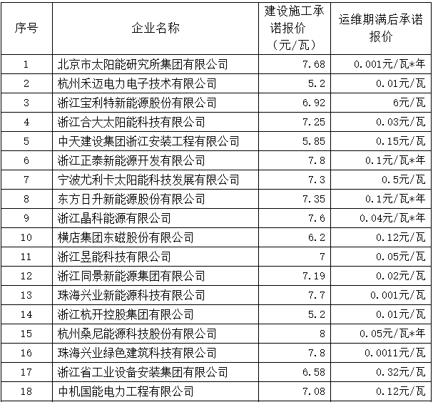 近日,浙江省扶貧辦公開浙江省光伏小康工程2016-2017年入圍省級目錄企業(yè)報價表。建設(shè)施工承諾報價最低5.2元/瓦,最高7.96元/瓦,平均6.838元/瓦。