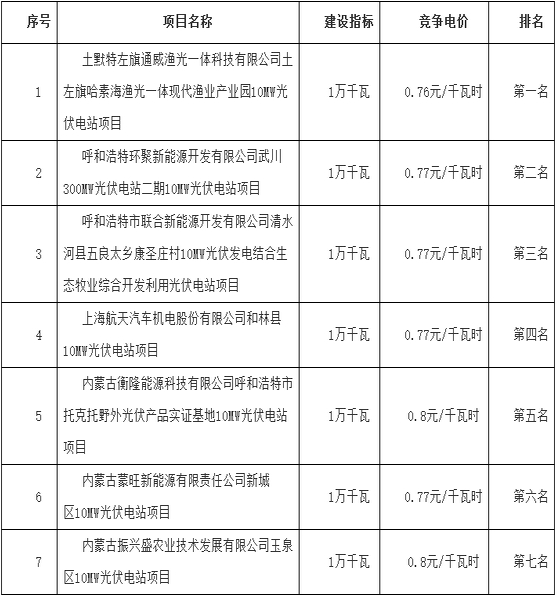 呼和浩特市2016年普通光伏電站項目評優(yōu)結(jié)果
