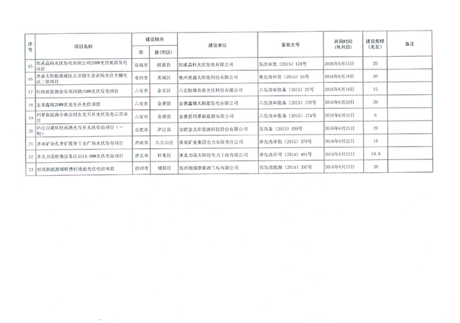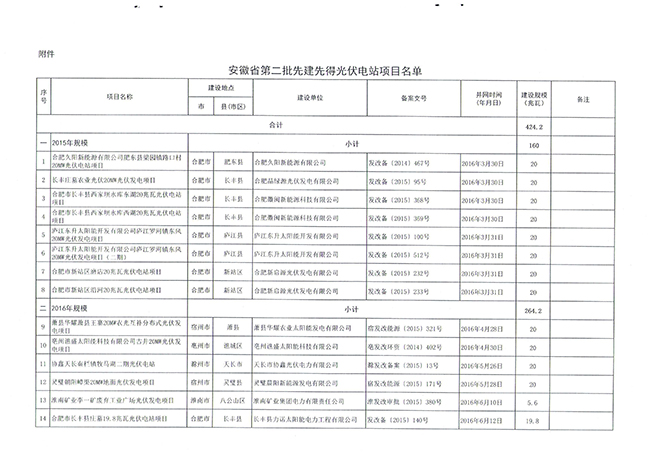 根據(jù)我局《關(guān)于進(jìn)一步加強(qiáng)光伏電站項(xiàng)目開發(fā)管理的通知》(皖能源新能〔2015〕26號(hào))和《關(guān)于完善“先建先得”分布式光伏電站管理的通知》(皖能源新能〔2016〕13號(hào))等文件規(guī)定,按并網(wǎng)先后順序,將我省2015年結(jié)余和2016年部分新增建設(shè)規(guī)模424.2兆瓦,配置給合肥久陽新能源有限公司肥東縣梁園鎮(zhèn)路口村20MW等23個(gè)光伏電站項(xiàng)目。