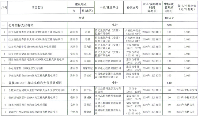 安徽省2016年光伏電站建設(shè)規(guī)模配置目錄