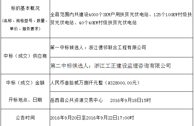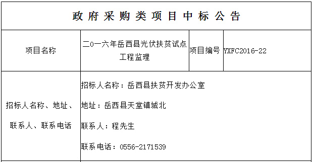 原標題:二0一六年岳西縣光伏扶貧試點工程監(jiān)理中標公示