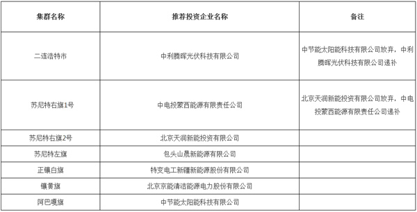 一、二連浩特市集群和阿巴嘎旗集群得分排名第一的投資商均為中節(jié)能太陽能股份有限公司,根據(jù)招商評優(yōu)辦法,中節(jié)能太陽能股份有限公司自主選擇投資建設(shè)阿巴嘎旗集群,二連浩特市集群投資商由該集群投資商中得分排名第二的中利騰暉光伏科技有限公司聯(lián)合體遞補。