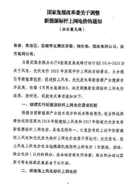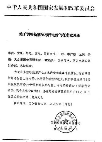 10月11日,國(guó)家發(fā)改委價(jià)格司向華能、大唐、華電、國(guó)電、國(guó)家電投、三峽、中廣核、龍?jiān)础f(xié)鑫、天合集團(tuán)公司財(cái)務(wù)部,國(guó)家電網(wǎng)、南方電網(wǎng)公司財(cái)務(wù)部,水規(guī)總院下發(fā)《關(guān)于調(diào)整新能源標(biāo)桿電價(jià)的征求意見(jiàn)函》。