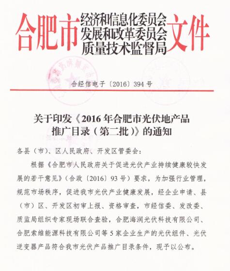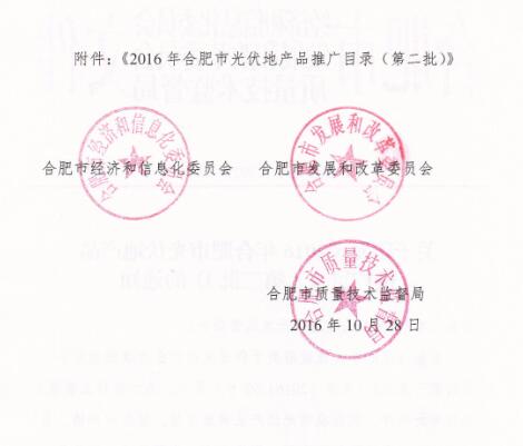 10月28日,合肥市經(jīng)信委、發(fā)改委以及質(zhì)監(jiān)局聯(lián)合發(fā)布《2016年合肥市光伏地產(chǎn)品推廣目錄(第二批)》的通知。