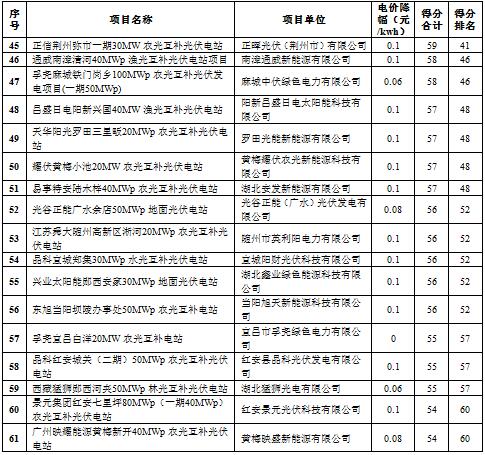 根據(jù)《國家發(fā)展改革委、國家能源局關(guān)于完善光伏發(fā)電規(guī)模管理和實(shí)行競爭方式配置項(xiàng)目的指導(dǎo)意見》(發(fā)改能源〔2016〕1163號)和《湖北省能源局關(guān)于印發(fā)2016年度光伏電站規(guī)模指標(biāo)競爭性分配工作方案的通知》(鄂能源新能〔2016〕101號)要求,湖北省能源局委托湖北省工程咨詢公司組織開展了2016年光伏電站項(xiàng)目競爭比選工作,并于10月11日-17日將比選結(jié)果在省發(fā)展改革委門戶網(wǎng)站上進(jìn)行了公示。公示期間,共有34家企業(yè)提出了比選結(jié)果復(fù)核申請,湖北省工程咨詢公司按相關(guān)規(guī)定和程序組織專家對比選結(jié)果進(jìn)行了認(rèn)真復(fù)核,并將復(fù)核結(jié)果提交省能源局,經(jīng)省能源局局長辦公會審核確認(rèn),現(xiàn)將競爭比選排序前60位的項(xiàng)目予以公布。
