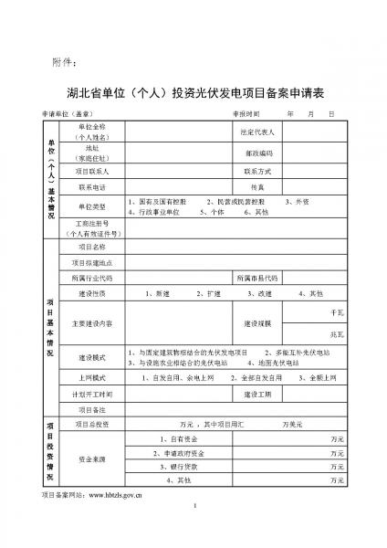 企業(yè)投資建設(shè)光伏發(fā)電項目,由項目單位(項目法人)填寫《湖北省單位(個人)投資光伏發(fā)電項目備案申請表》,如實提供項目單位(項目法人)的工商登記等書面證明材料,向項目所在地發(fā)展改革部門提出備案申請,由項目所在地發(fā)展改革部門按照國家和省規(guī)定時限和要求辦理備案手續(xù)。項目單位(項目法人)憑備案證到規(guī)劃、土地、環(huán)保、林業(yè)、電力等部門辦理項目建設(shè)所需相關(guān)手續(xù)。