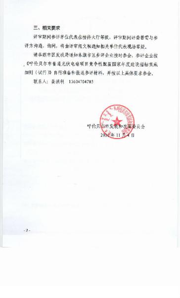 原標(biāo)題:呼倫貝爾市發(fā)展和改革委員會(huì)關(guān)于參加呼倫貝爾市普通光伏電站項(xiàng)目2016年度建設(shè)指標(biāo)競(jìng)爭性配置評(píng)審會(huì)的通知