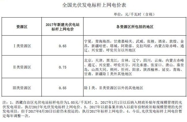 根據(jù)當(dāng)前新能源產(chǎn)業(yè)技術(shù)進(jìn)步和成本降低情況,降低2017年1月1日之后新建光伏發(fā)電和2018年1月1日之后新核準(zhǔn)建設(shè)的陸上風(fēng)電標(biāo)桿上網(wǎng)電價(jià),具體價(jià)格見(jiàn)附件1和附件2。2018年前如果新建陸上風(fēng)電項(xiàng)目工程造價(jià)發(fā)生重大變化,國(guó)家可根據(jù)實(shí)際情況調(diào)整上述標(biāo)桿電價(jià)。之前發(fā)布的上述年份新建陸上風(fēng)電標(biāo)桿上網(wǎng)電價(jià)政策不再執(zhí)行。光伏發(fā)電、陸上風(fēng)電上網(wǎng)電價(jià)在當(dāng)?shù)厝济簷C(jī)組標(biāo)桿上網(wǎng)電價(jià)(含脫硫、脫硝、除塵電價(jià))以內(nèi)的部分,由當(dāng)?shù)厥〖?jí)電網(wǎng)結(jié)算;高出部分通過(guò)國(guó)家可再生能源發(fā)展基金予以補(bǔ)貼。