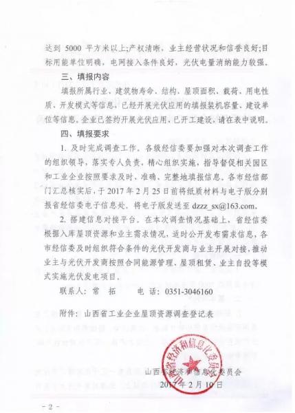 2017年2月10日,山西省經(jīng)濟(jì)和信息化委員會(huì)印發(fā) 晉經(jīng)信電子函〔2017〕40號(hào)《山西省經(jīng)濟(jì)和信息化委員會(huì)關(guān)于開展全省工業(yè)企業(yè)光伏屋頂資源調(diào)查的函》文件。要求全省經(jīng)信委、產(chǎn)業(yè)園區(qū)對(duì)轄區(qū)內(nèi)符合條件的工業(yè)企業(yè)進(jìn)行資源摸底調(diào)查。單體3000平方米以及產(chǎn)業(yè)園區(qū)綜合達(dá)到5000平方米的即納入申報(bào)范圍。
