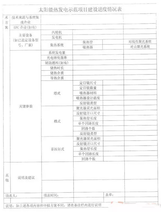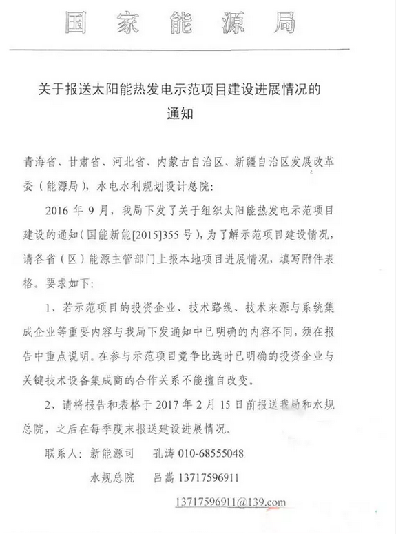 近日,國家能源局發(fā)布《關(guān)于報(bào)送太陽能熱發(fā)電示范項(xiàng)目建設(shè)進(jìn)展情況的通知》(以下簡稱“通知”)。為了解示范項(xiàng)目建設(shè)情況,各省區(qū)能源主管部門須上報(bào)本地項(xiàng)目進(jìn)展情況。