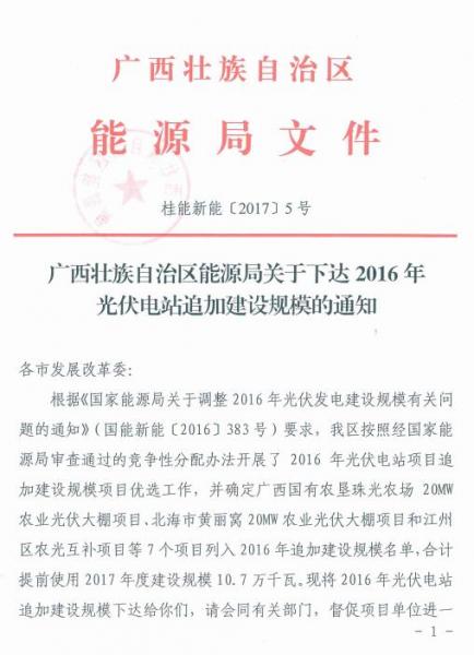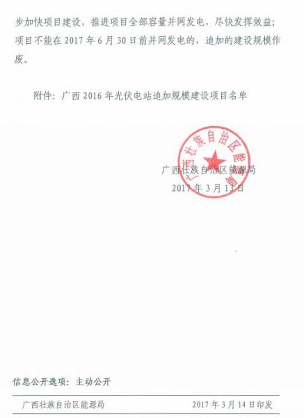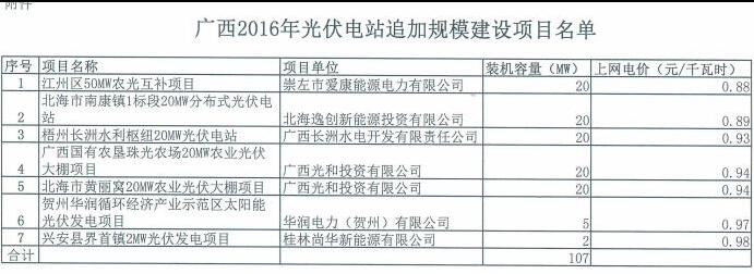 廣西壯族自治區(qū)能源局公布了廣西2016年光伏電站追加規(guī)模建設(shè)項(xiàng)目名單,共有7個(gè)項(xiàng)目獲得競(jìng)爭(zhēng)性配置規(guī)模,追加總規(guī)模為10.7萬千瓦。項(xiàng)目不能在2017年6月30日前并網(wǎng)發(fā)電的,追加建設(shè)規(guī)模作廢。