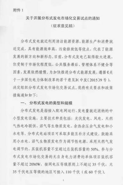 國家能源局?jǐn)M推動分布式發(fā)電市場化交易試點(含征求意見稿全文