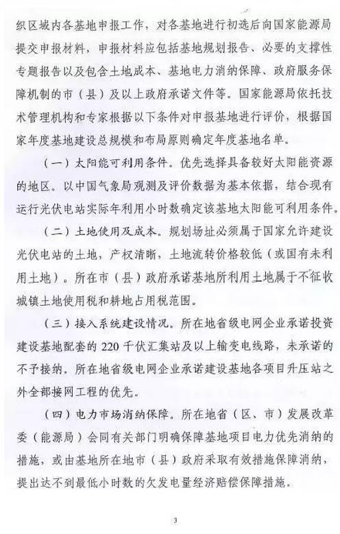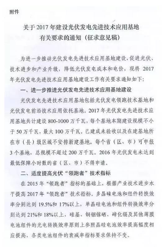 近日,國家能源局綜合司發(fā)出了名為《國家能源局綜合司關(guān)于2017年建設(shè)光伏發(fā)電先進(jìn)技術(shù)應(yīng)用基地有關(guān)要求的通知》的征求意見函,對(duì)光伏發(fā)電先進(jìn)技術(shù)應(yīng)用基地建設(shè)的規(guī)劃、優(yōu)選、評(píng)分規(guī)則等做意見征集,通知全文如下所示:! ⊥ㄖ蟀l(fā)展改革委、工業(yè)和信息化部、財(cái)政部、國家認(rèn)監(jiān)委辦公廳、各省(區(qū)、