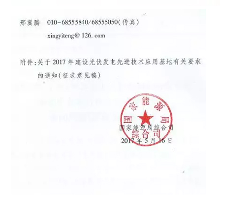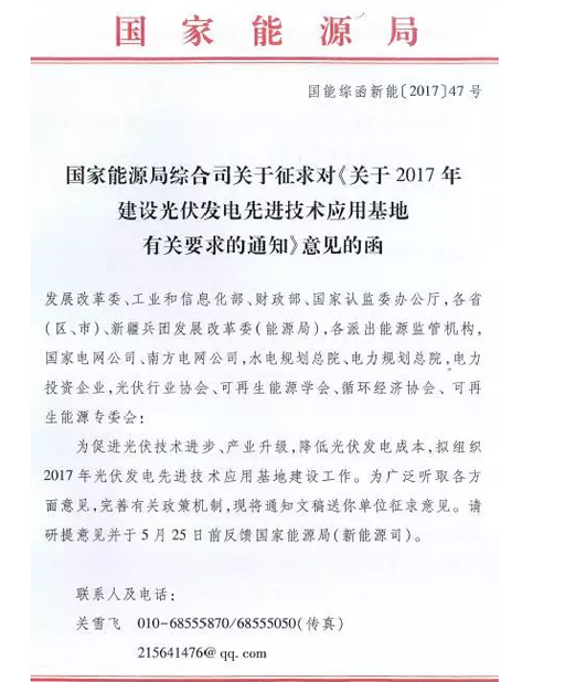 為促進(jìn)光伏技術(shù)進(jìn)步、產(chǎn)業(yè)升級(jí),降低光伏發(fā)電成本,擬組織2017年光伏發(fā)電先進(jìn)技術(shù)應(yīng)用基地建設(shè)工作。為廣泛聽取各方面意見,完善有關(guān)政策機(jī)制,現(xiàn)將通知文稿送你單位征求意見。請(qǐng)研提意見在5月25日之前反饋到國家能源局新能源司。