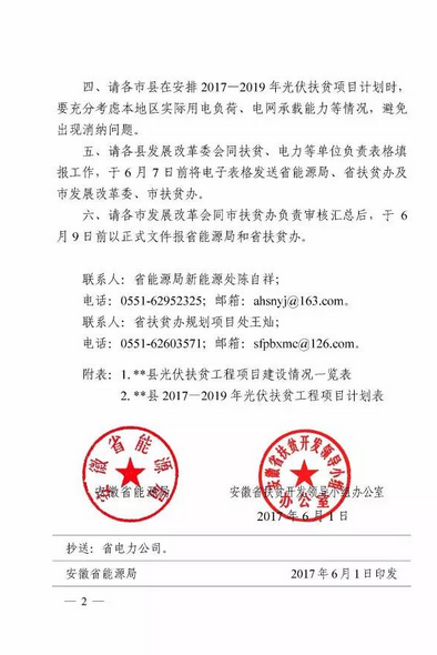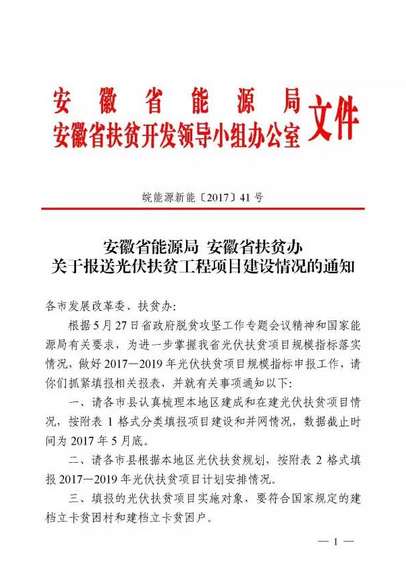 近日,安徽省能源局、安徽扶貧開發(fā)領(lǐng)導(dǎo)小組辦公室聯(lián)合印發(fā) 皖能源新能〔2017〕41號 《安徽省能源局安徽省扶貧辦關(guān)于報送光伏扶貧工程項目建設(shè)情況的通知》。