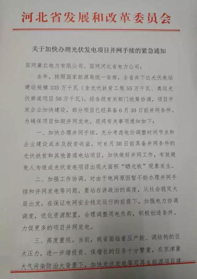 6月28日,河北省發(fā)改委發(fā)布《關(guān)于加快辦理光伏發(fā)電項(xiàng)目并網(wǎng)手續(xù)的緊急通知》,要求加快辦理并網(wǎng)手續(xù)、加快工作協(xié)調(diào),高度重視光伏發(fā)電等可再生能源的建設(shè)。