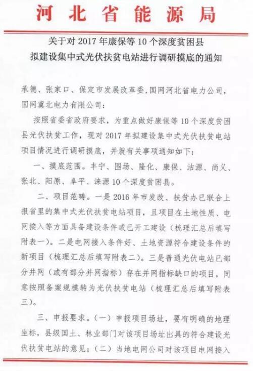 河北省能源局關(guān)于對2017年康保等10個深度貧困縣擬建設(shè)集中式光伏扶貧電站進(jìn)行調(diào)研摸底的通知