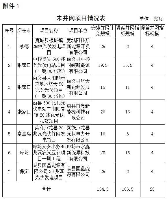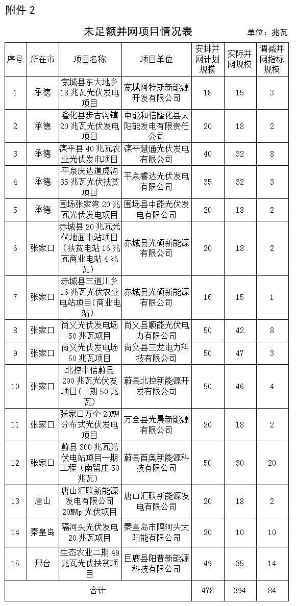按照河北省能源局《關(guān)于對光伏發(fā)電項(xiàng)目開展核查摸底工作的緊急通知》和《關(guān)于組織企業(yè)出具并網(wǎng)承諾函的緊急通知》要求,已列入并網(wǎng)計(jì)劃項(xiàng)目應(yīng)于6月30日前建成并網(wǎng),未并網(wǎng)項(xiàng)目(并網(wǎng)指標(biāo))將進(jìn)行調(diào)減。經(jīng)省級(jí)電網(wǎng)公司確認(rèn),現(xiàn)對未按要求并網(wǎng)的普通光伏發(fā)電項(xiàng)目(并網(wǎng)指標(biāo))予以調(diào)減,有關(guān)情況公示如下: 一、6月30日