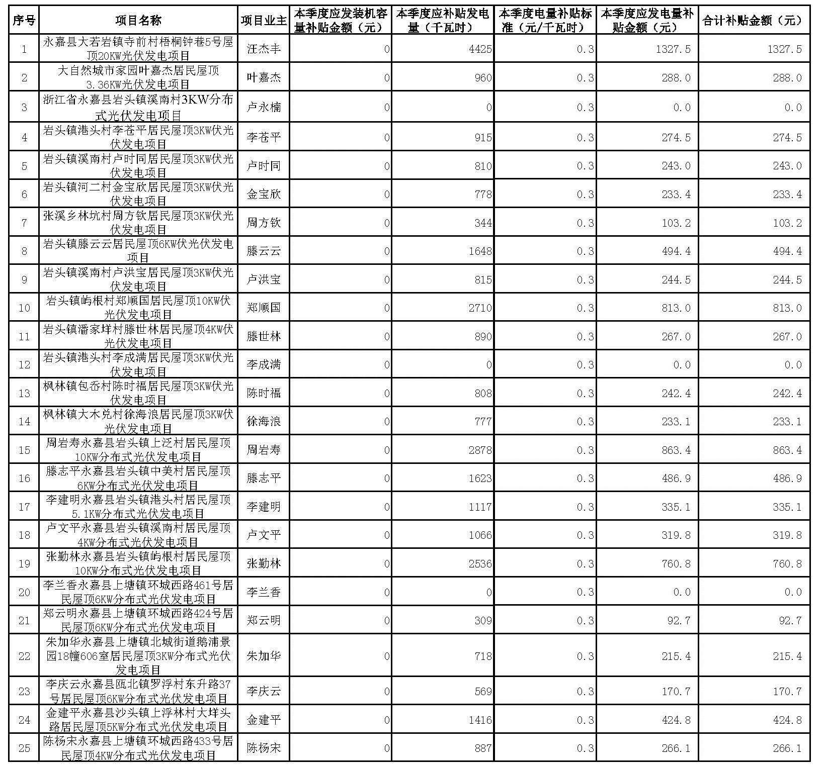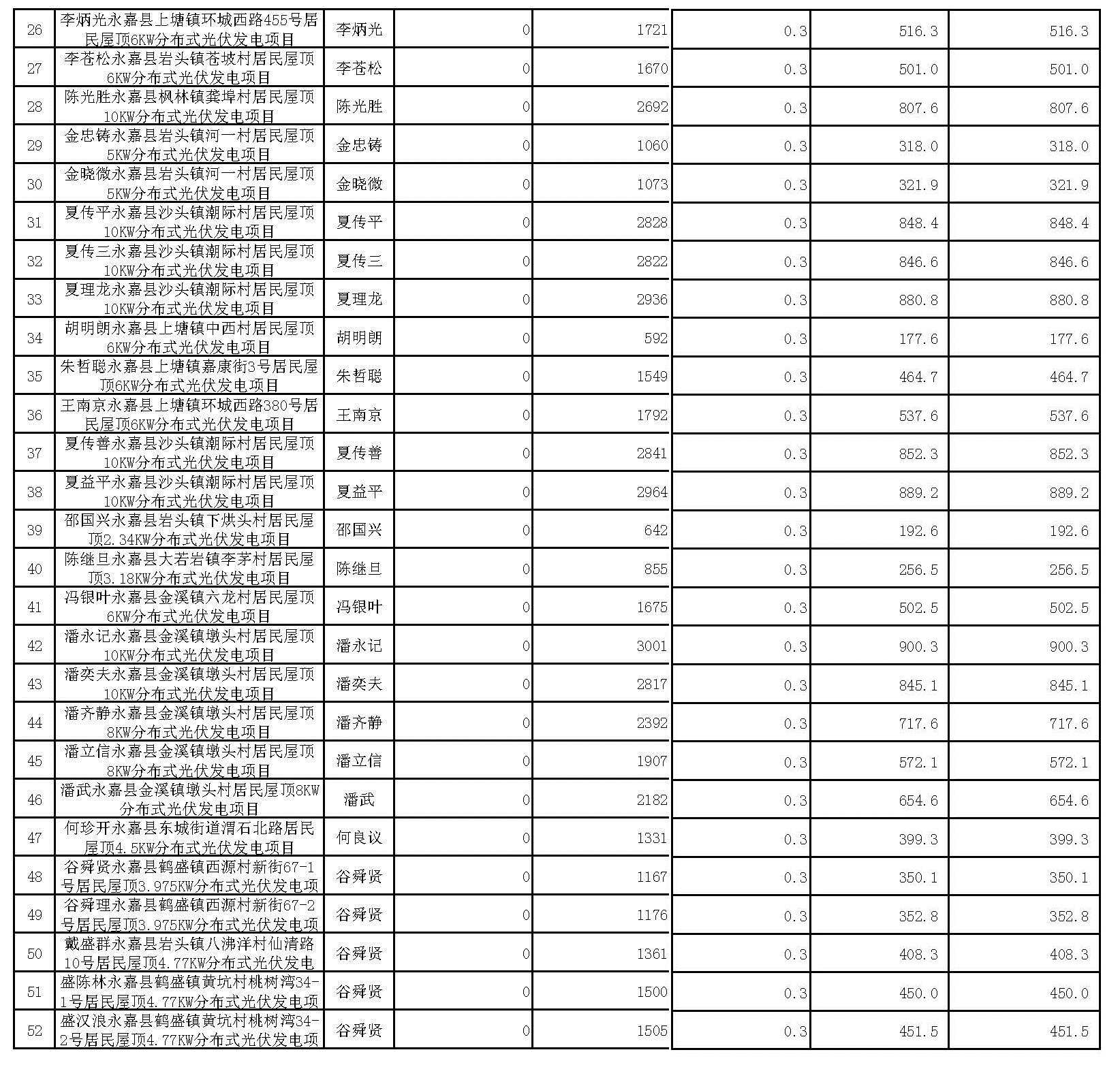 根據(jù)《永嘉縣人民政府關(guān)于扶持分布式光伏發(fā)電的若干意見》(永政發(fā)〔2013〕282號(hào))、《永嘉縣人民政府關(guān)于進(jìn)一步明確永嘉縣分布式光伏發(fā)電項(xiàng)目2016年補(bǔ)貼政策的通知》(永政發(fā)〔2016〕168號(hào))文件精神,現(xiàn)將2017年第二季度永嘉縣分布式光伏發(fā)電擬補(bǔ)貼項(xiàng)目予以公示,接受社會(huì)各界監(jiān)督。公示起止時(shí)間為2017年 7