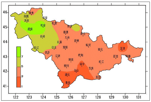 風能資源空間分布。風速的時空分布特征明顯,中西部地區(qū)風速和風功率相對較大,東部地區(qū)風速和風功率密度明顯要低于西部地區(qū),其中白城、松原、四平雙遼等地區(qū)風能資源分布更為集中。中西部地區(qū)地勢平坦,風速大,10米高度年平均風速在2.5~4.5米/秒之間,風功率密度在50.0~150.0瓦/平方米之間;70米高度年平均風速在5.5~7.5米/秒之間,風功率密度在200.0~400.0瓦/平方米之間。東部山區(qū)和半山區(qū)對西風環(huán)流的阻擋,風速較中西部地區(qū)小,除個別山頂和峽谷地區(qū)外,大部分區(qū)域10米高度年平均風速在1.5~3.5米/秒之間,風功率密度在25.0~75.0瓦/平方米之間;70米高度年平均風速在3.5~5.5米/秒之間,風功率密度在100.0~200.0瓦/平方米之間。風速年內(nèi)以春季風速最大,秋季次之,夏季最;日內(nèi)以白天風速相對較小,晚上風速較大,風功率密度分布規(guī)律與風速分布規(guī)律基本一致。
