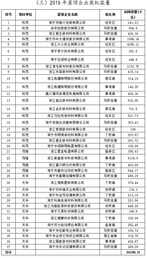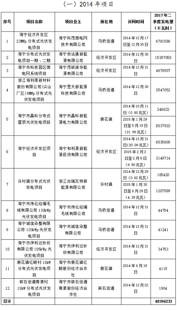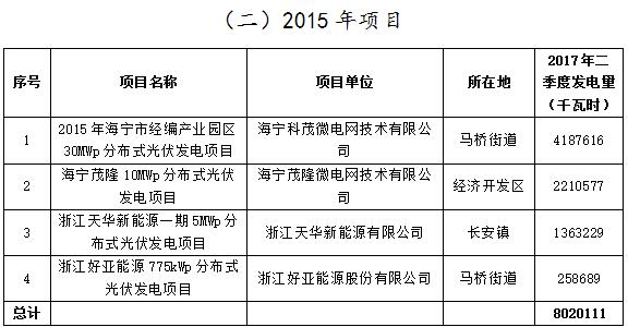 浙江海寧2017Q2分布式光伏項目擬補助發(fā)電量及2015年屋頂企業(yè)裝機容量公示