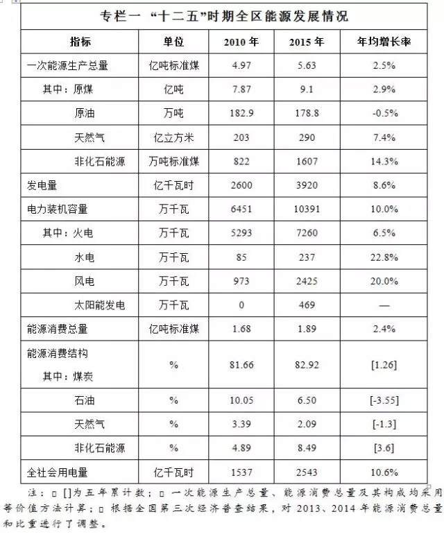 能源結(jié)構(gòu)不斷優(yōu)化。“十二五”期間,全區(qū)能源結(jié)構(gòu)由傳統(tǒng)化石能源為主逐步向化石能源和非化石能源并重轉(zhuǎn)變,能源發(fā)展呈現(xiàn)出多元化、低碳化的特征。天然氣和非化石能源在一次能源生產(chǎn)總量中的比重分別提高至2015年的6.9%和2.9%,較2010年分別提高1.5個和1.2個百分點;煤炭在一次能源生產(chǎn)總量中的比重降低至2015年的90%以下,較2010年下降2.6個百分點;非化石能源裝機比重由2010年的16.4%提高至30.1%;非化石能源消費比重提高至8.5%,“十二五”期間累計提高3.6個百分點。