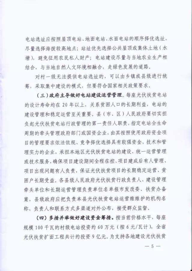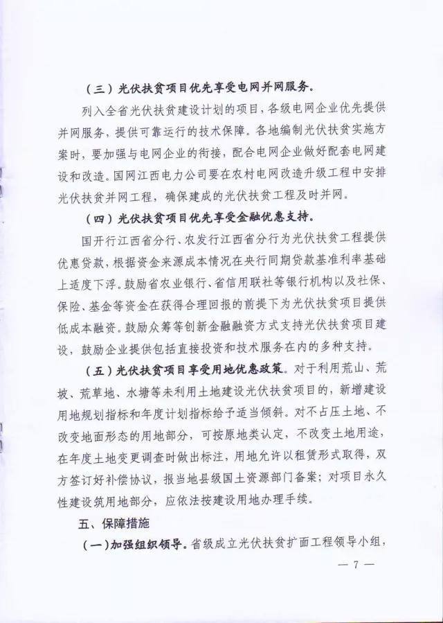 近日,江西省發(fā)改委印發(fā)《關(guān)于實施光伏扶貧擴面工程的指導(dǎo)意見(征求建議稿)》意見的函,對光伏扶貧做出了多項優(yōu)先支持政策:1、光伏扶貧項目優(yōu)先列入全省光伏建設(shè)計劃;2、光伏扶貧項目優(yōu)先享受財政度電補貼政策;3、光伏扶貧項目優(yōu)先享受電網(wǎng)并網(wǎng)服務(wù);4、光伏扶貧項目優(yōu)先享受金融優(yōu)惠支持;5、光伏扶貧項目享受用地優(yōu)