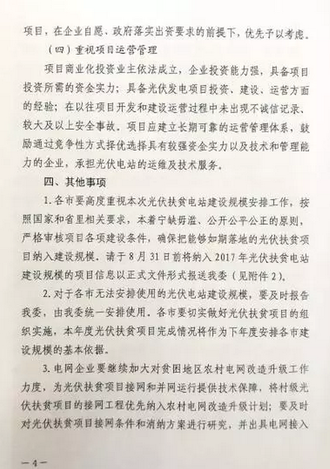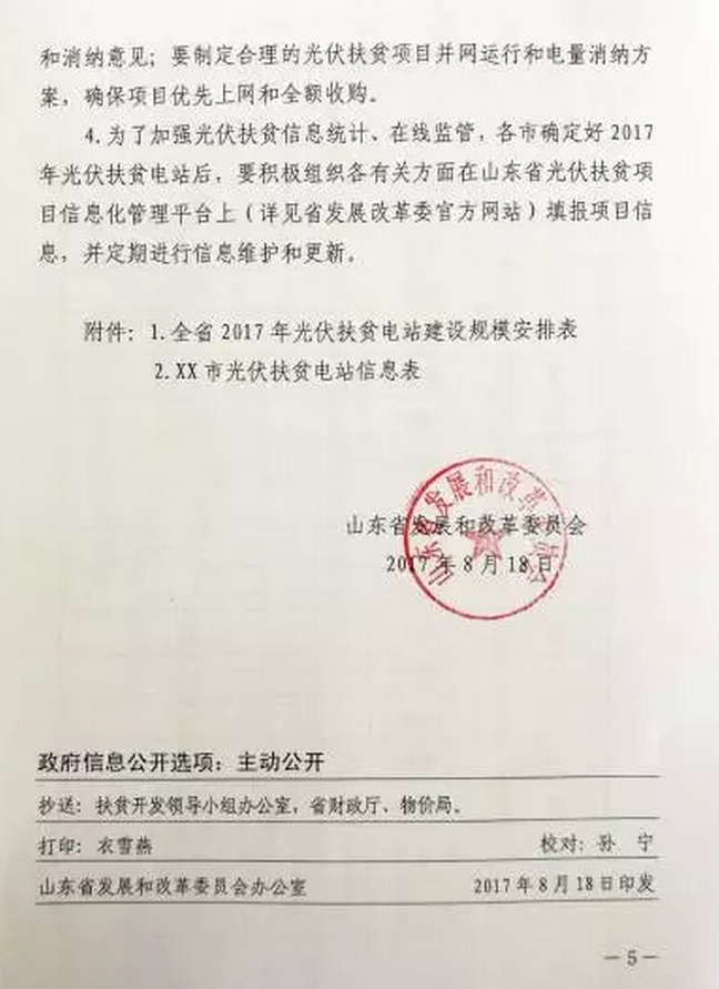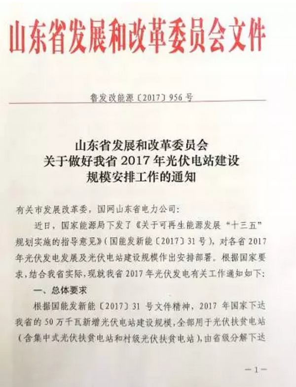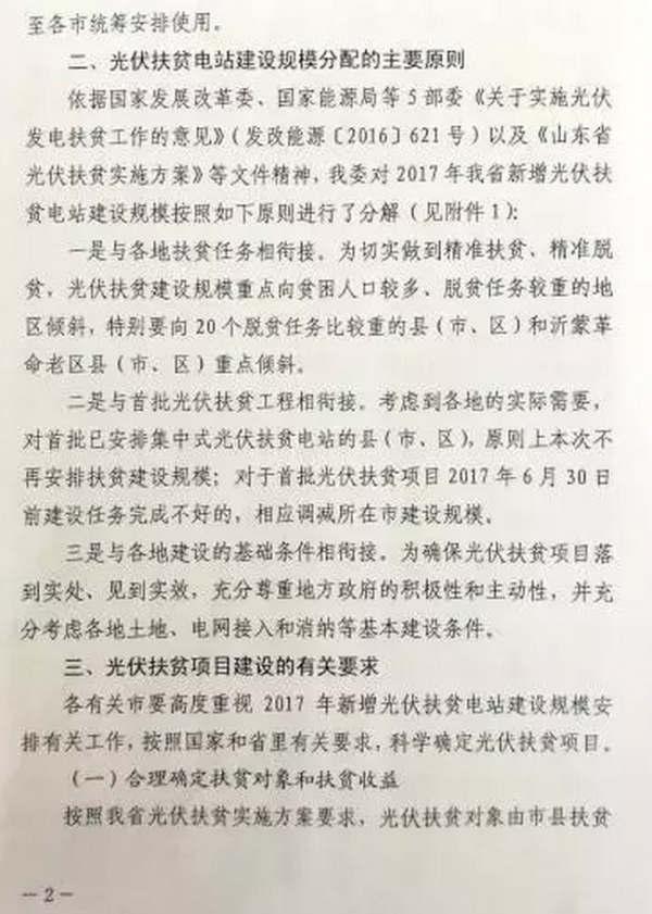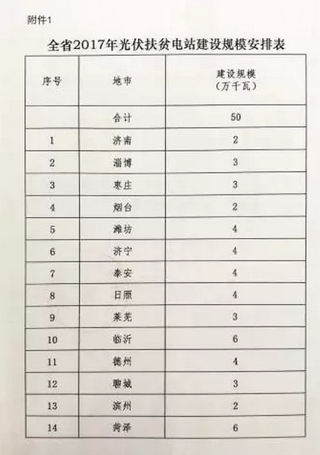 日前,山東省發(fā)布《關(guān)于做好我省2017年光伏電站建設規(guī)模安排工作的通知》,明確2017年新增500MW指標全部用于光伏扶貧,并將指標劃分至各地級市,指標向脫貧任務重的縣市區(qū)以及沂蒙革命傾斜。其中,臨沂、菏澤分配規(guī)模最大,為60MW,濰坊、濟寧、泰安、日照、德州為40MW。原文如下: