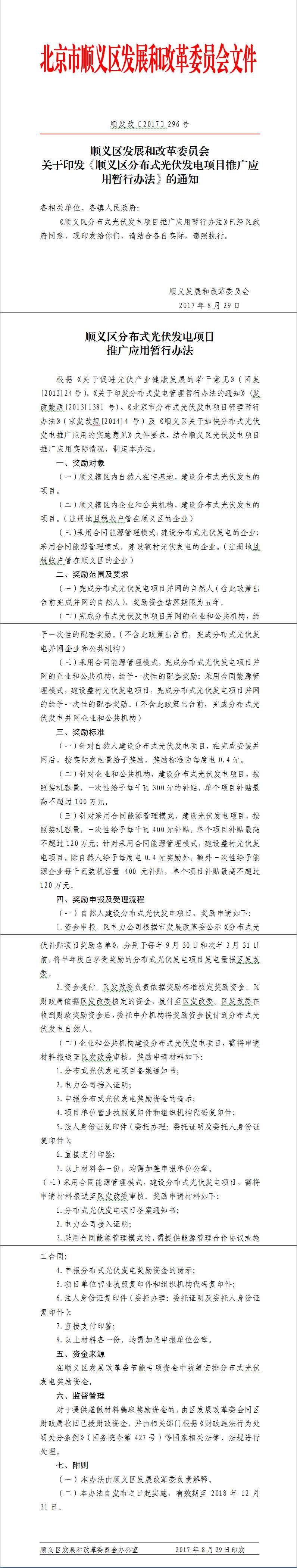 近日,北京市順義區(qū)發(fā)改委出臺了《順義區(qū)分布式光伏發(fā)電項(xiàng)目推廣應(yīng)用暫行辦法》,一是關(guān)于自然人。給予持續(xù)5年,每度電0.4元的補(bǔ)貼。二是關(guān)于企業(yè)和公共機(jī)構(gòu)。給予每千瓦裝機(jī)容量300元的補(bǔ)貼,不超過100萬。三是關(guān)于合同能源管理模式。給予每千瓦裝機(jī)容量400元的補(bǔ)貼,不超過120萬。四是關(guān)于試點(diǎn)示范建設(shè)。