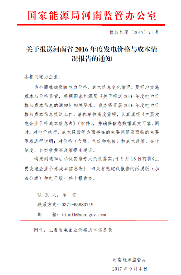 關(guān)于報(bào)送河南省2016年度發(fā)電價(jià)格與成本情況報(bào)告的通知