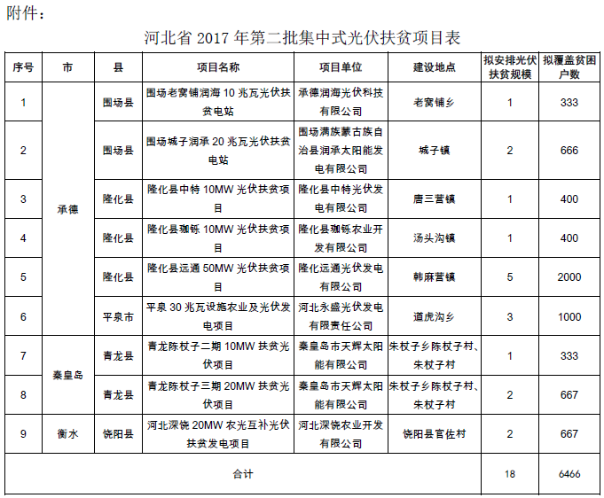 根據(jù)《關(guān)于開(kāi)展2017年集中式光伏扶貧項(xiàng)目申報(bào)工作的通知》(冀發(fā)改能源〔2017〕1025號(hào))要求,經(jīng)各市申報(bào)、電網(wǎng)公司確認(rèn)、專家審查,現(xiàn)對(duì)全省2017年集中式光伏扶貧項(xiàng)目(第二批)安排有關(guān)情況,予以公示! ”敬斡(jì)劃安排集中式光伏扶貧項(xiàng)目9個(gè)、18萬(wàn)千瓦,可覆蓋貧困人口6466戶,具體名單
