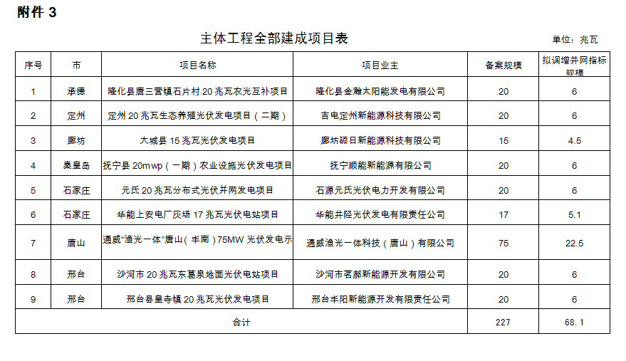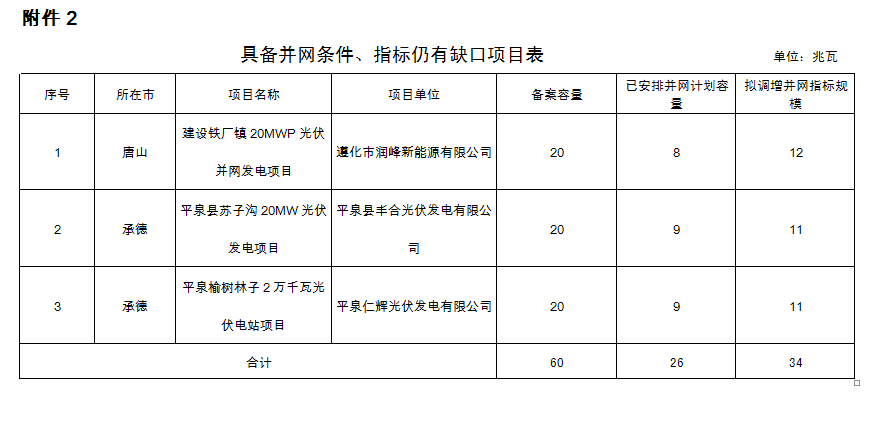 二、6月30日前,具備并網(wǎng)條件,但因冀北暫停并網(wǎng)原因未并網(wǎng)、仍有指標(biāo)缺口的項目,予以補(bǔ)齊缺口。涉及項目3個、34兆瓦(附表2)。
