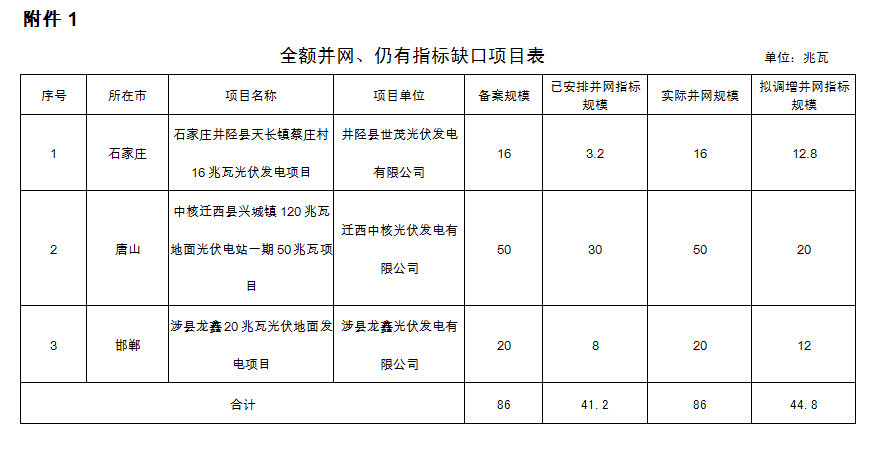 一、6月30日前,已全額并網(wǎng),仍有指標(biāo)缺口的項目,予以補(bǔ)齊缺口。涉及項目3個、44.8兆瓦(附表1)。