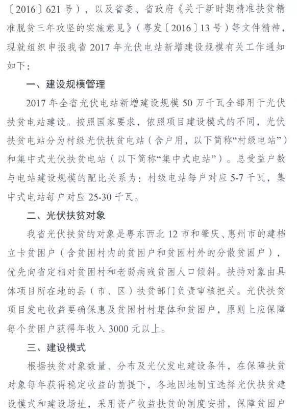 近日,廣東省發(fā)改委和廣東省扶貧辦聯(lián)合發(fā)布《組織申報2017年光伏電站新增建設(shè)規(guī)模的通知》,要求2017年500MW新增建設(shè)規(guī)模全部用于光伏扶貧,其中村級電站每戶對應(yīng)5-7千瓦、集中式電站每戶對應(yīng)25-30千瓦。指標(biāo)分配將優(yōu)先支持已建成、還未取得年度建設(shè)規(guī)模指標(biāo)的光伏扶貧項目;此外村級電站優(yōu)先納入建設(shè)規(guī)模。從地區(qū)上看,原中央蘇區(qū)、欠發(fā)達革命老區(qū)和少數(shù)民族地區(qū)以及國家綠色能源示范縣的光伏扶貧項目優(yōu)先納入建設(shè)規(guī)模。對于集中式電站,綜合考慮項目占地面積、項目用地性質(zhì)、項目用地和扶貧資金落實情況、縣級有關(guān)部門支持情況、電力消納和送出條件、綜合開發(fā)利用等因素,統(tǒng)籌安排建設(shè)規(guī)模。