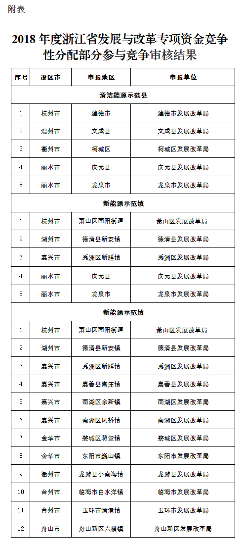 關(guān)于2018年度浙江省發(fā)展與改革專(zhuān)項(xiàng)資金競(jìng)爭(zhēng)性分配部分(支持可再生能源發(fā)展部分)競(jìng)爭(zhēng)性分配的公告 根據(jù)《省發(fā)展改革委關(guān)于印發(fā)2018年度浙江省發(fā)展與改革專(zhuān)項(xiàng)資金競(jìng)爭(zhēng)性分配部分實(shí)施方案的通知》(浙發(fā)改能源〔2017〕807號(hào))競(jìng)爭(zhēng)性分配程序,現(xiàn)已完成清潔能源示范縣、新能源示范鎮(zhèn)申報(bào)材料初步審核和審核確認(rèn)兩個(gè)階段工作,下步