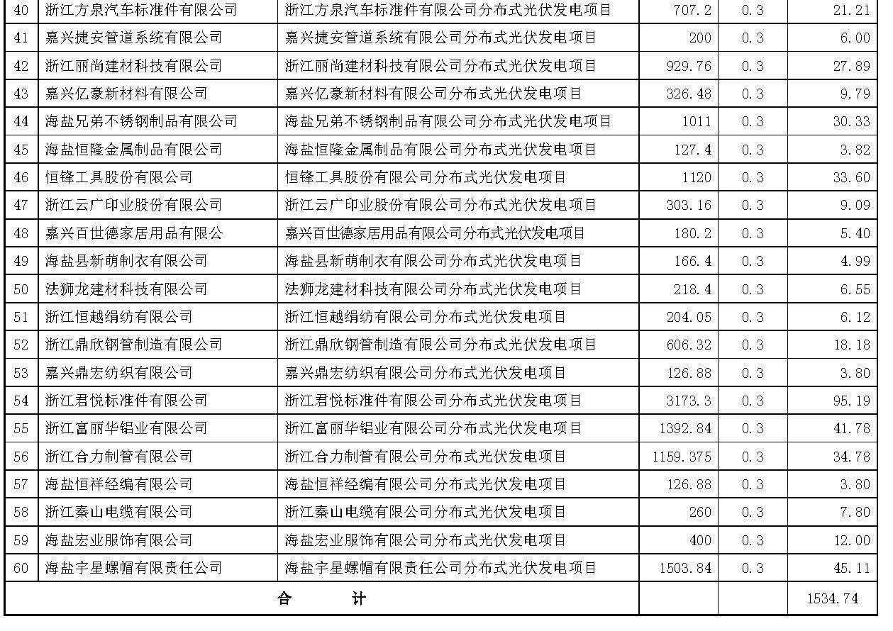 為促進(jìn)我縣光伏產(chǎn)業(yè)健康發(fā)展,根據(jù)《海鹽縣人民政府關(guān)于印發(fā)2016年海鹽縣推進(jìn)光伏發(fā)電應(yīng)用實(shí)施方案的通知》(鹽政發(fā)〔2016〕22號(hào))精神和縣財(cái)政局印發(fā)《海鹽縣工業(yè)發(fā)展財(cái)政專項(xiàng)資金管理辦法(試行)》(鹽財(cái)企〔2016〕30號(hào))規(guī)定,經(jīng)審核本次共有60家企業(yè)符合補(bǔ)助條件,經(jīng)報(bào)縣政府同意,現(xiàn)撥付第五批光伏發(fā)電項(xiàng)目屋頂資源提供方財(cái)政補(bǔ)助資金1534.74萬(wàn)元,資金列專用基金“工業(yè)發(fā)展資金”支出。