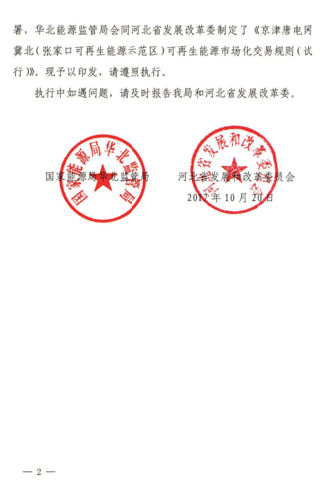 華北能源監(jiān)管局、河北省發(fā)改委日前聯(lián)合印發(fā)了《京津唐電網(wǎng)冀北(張家口可再生能源示范區(qū))可再生能源市場化交易規(guī)則(試行)》特急文件。規(guī)則中所稱可再生能源市場化交易,主要是指準入的電力用戶與并網(wǎng)可再生能源發(fā)電企業(yè),對保障性收購年利用小時數(shù)以外的電量,通過掛牌、協(xié)商、競價等市場化交易方式進行的中長期電量交易。